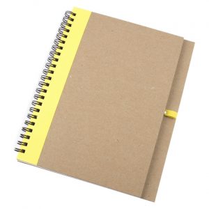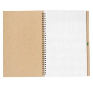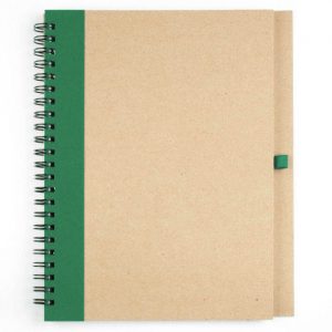 Блокнот A5 з кольоровою смужкою . Розмір обкладинки 148*210 мм, підкладка 163*210 мм , блок розміром 148*210 мм. Обкладинака та підкладинка зроблені з крафт картона. Блок білий стандартний ( клітинка ) . Місце для ручки . Кріпиться на пружину , по довгій стороні .