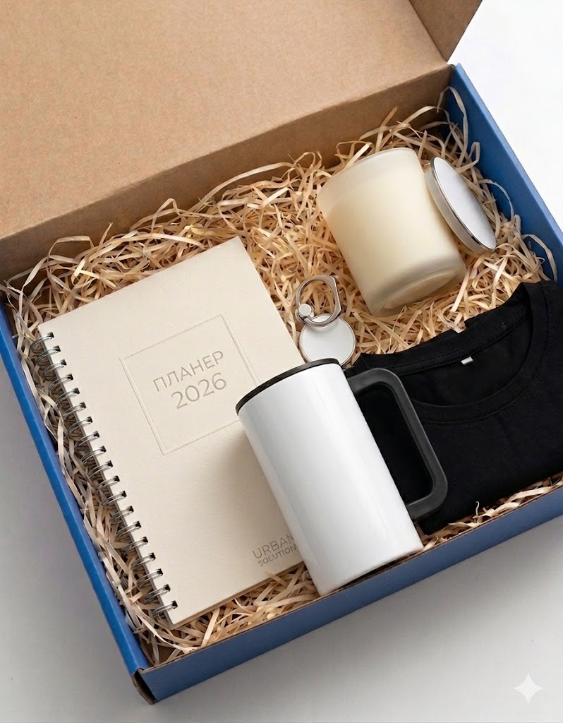 На фото представлений базовий склад набору. Ми нанесемо ваш логотип на кожен елемент за допомогою преміальних методів друку (DTF, УФ та сублімація).