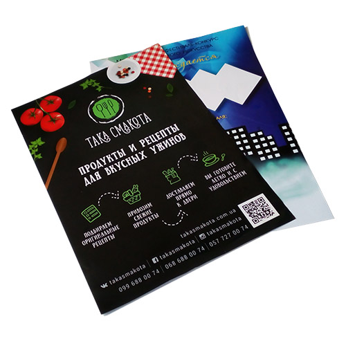 Листівки А4 , розміром 210*297 мм . Папір глянцевий 130 г/м2. Повнокольоровий друк з двох сторін .