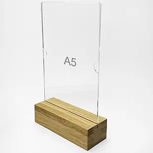 Менюхолдер А5 з дерев’яною підставкою. Вертикальна підставка. Прозорий акрил 1,8мм. Під листівку-меню А5 (148 * 210 мм). Та дерев’яна підставка 50 мм. Вартість вказана за одиницю