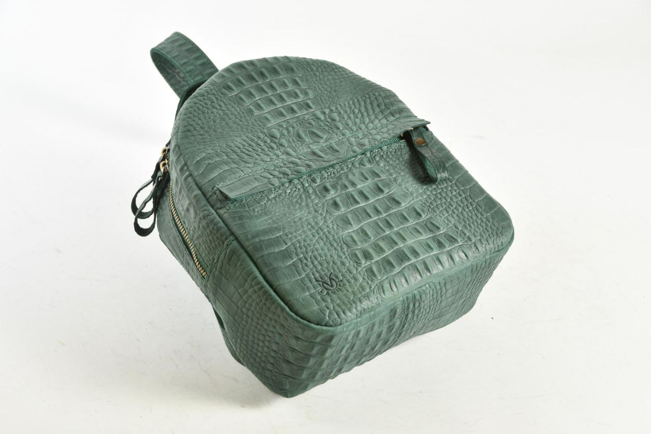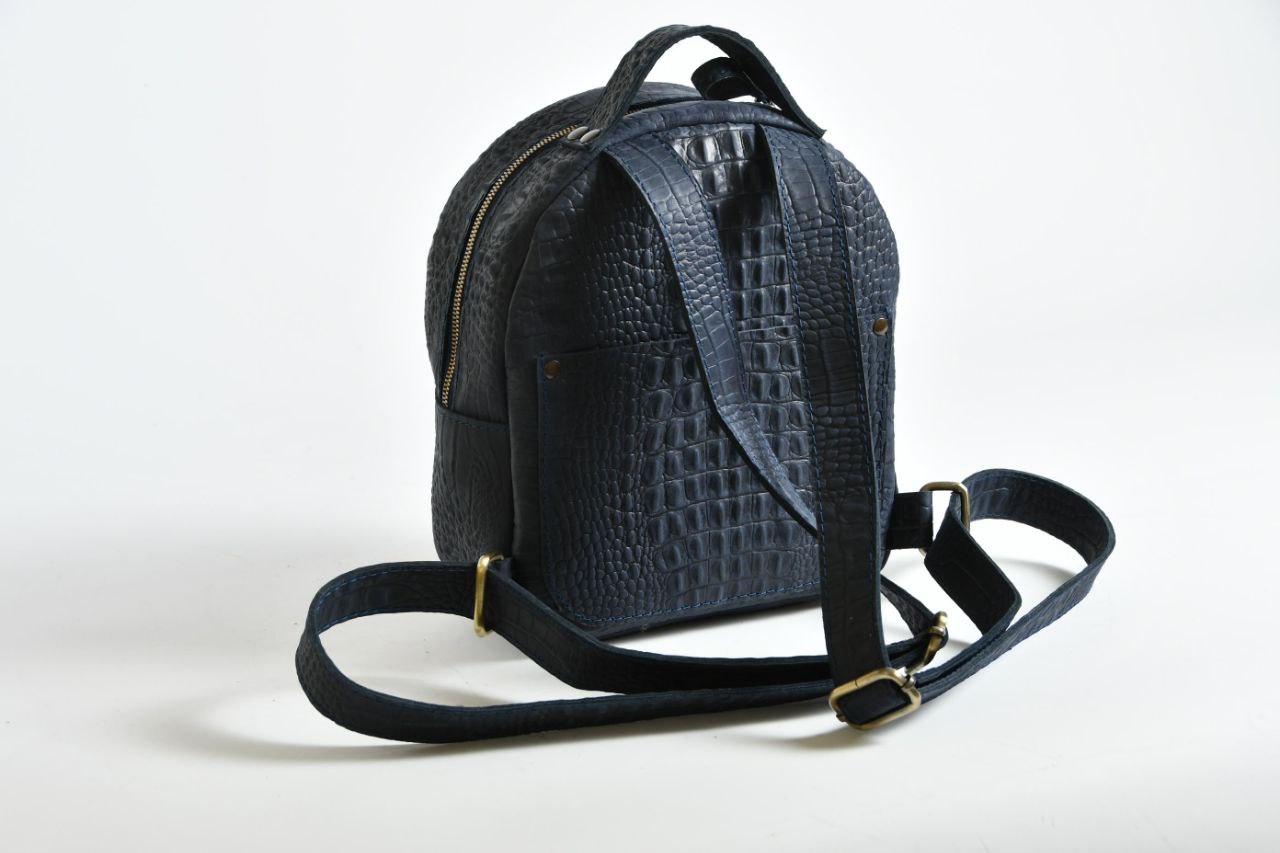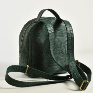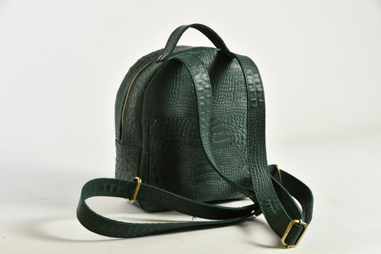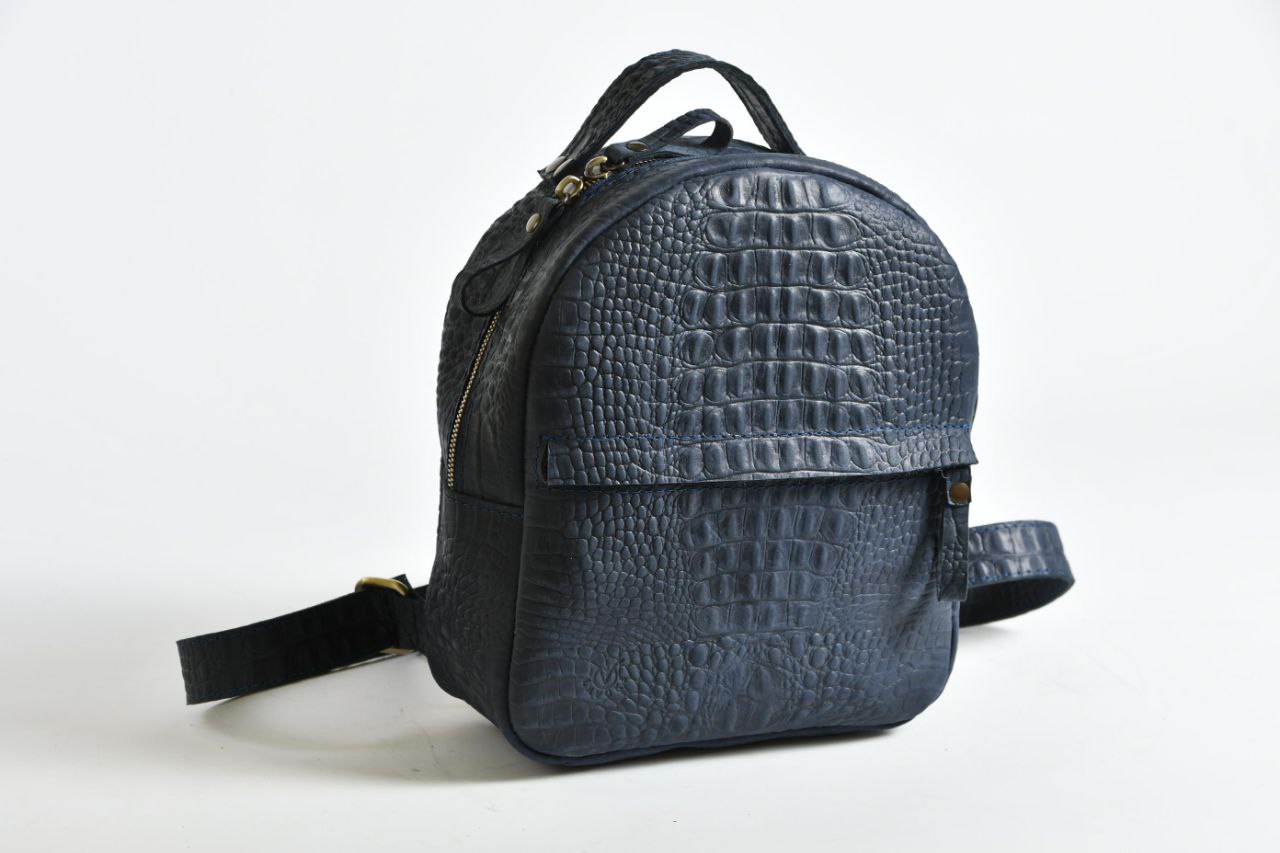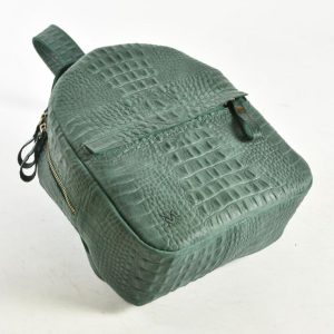 Рюкзак “Кайман” зроблений середнього розміру- 26 х 22 х 9 см , але дуже місткий. Попереду кишеня на замочку. Позаду звичайна кишенька. Всередині доволі глибока кишеня. Без підкладки. Матеріал: натуральна шкіра крейзі хорс з тисненням “під каймана” .