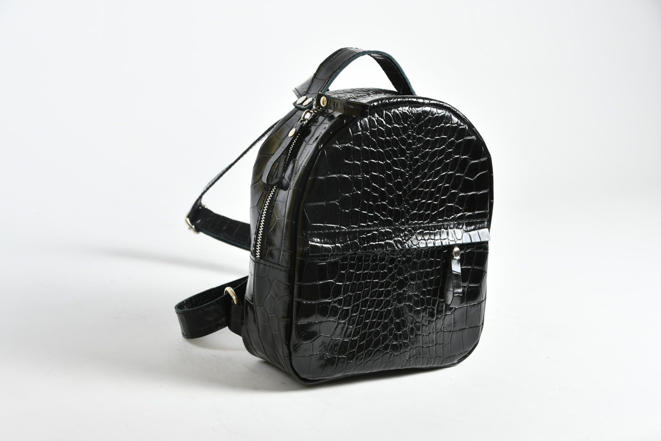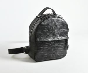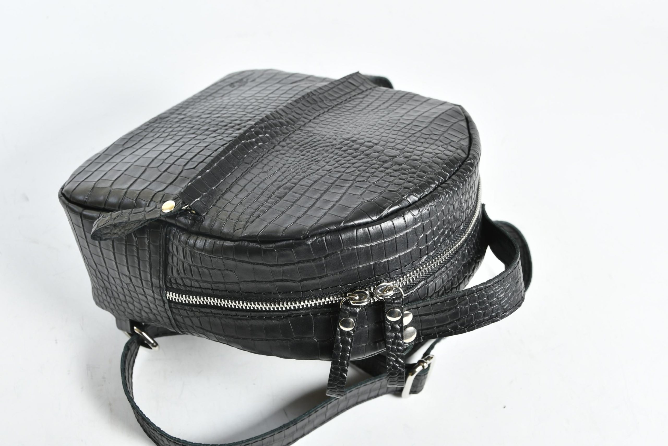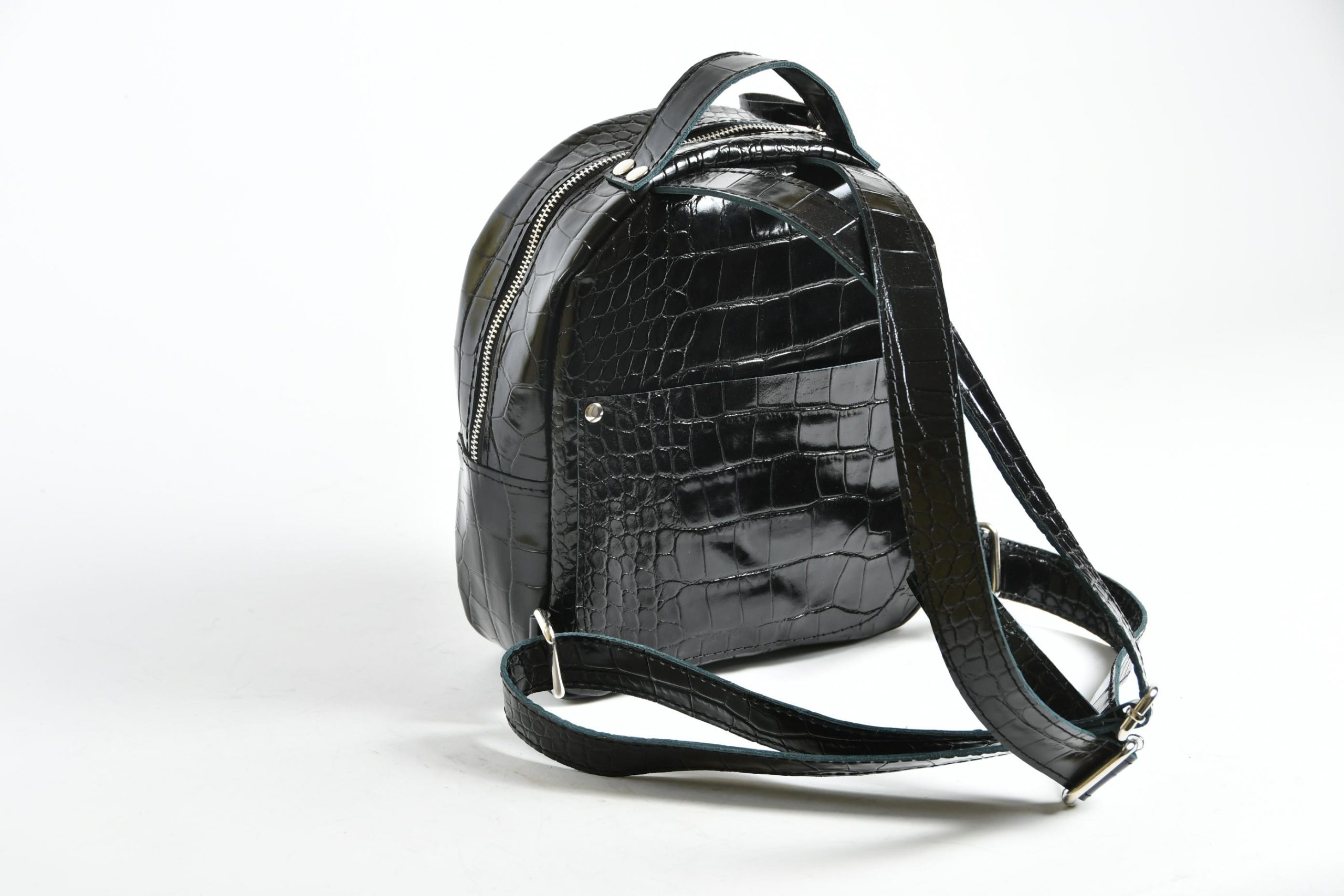 Рюкзак середнього розміру, але дуже місткий. Попереду кишеня на замочку. Позаду звичайна кишенька. Всередині доволі глибока кишеня. Без підкладки. Матеріал: натуральна шкіра італійського виробництва з тисненням “під крокодила”, стійка поверхня з невеликим глянцем, глибокий насичений колір . Розмір: 26 х 22 х 9 см.
