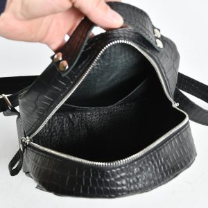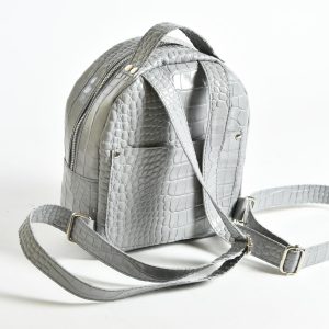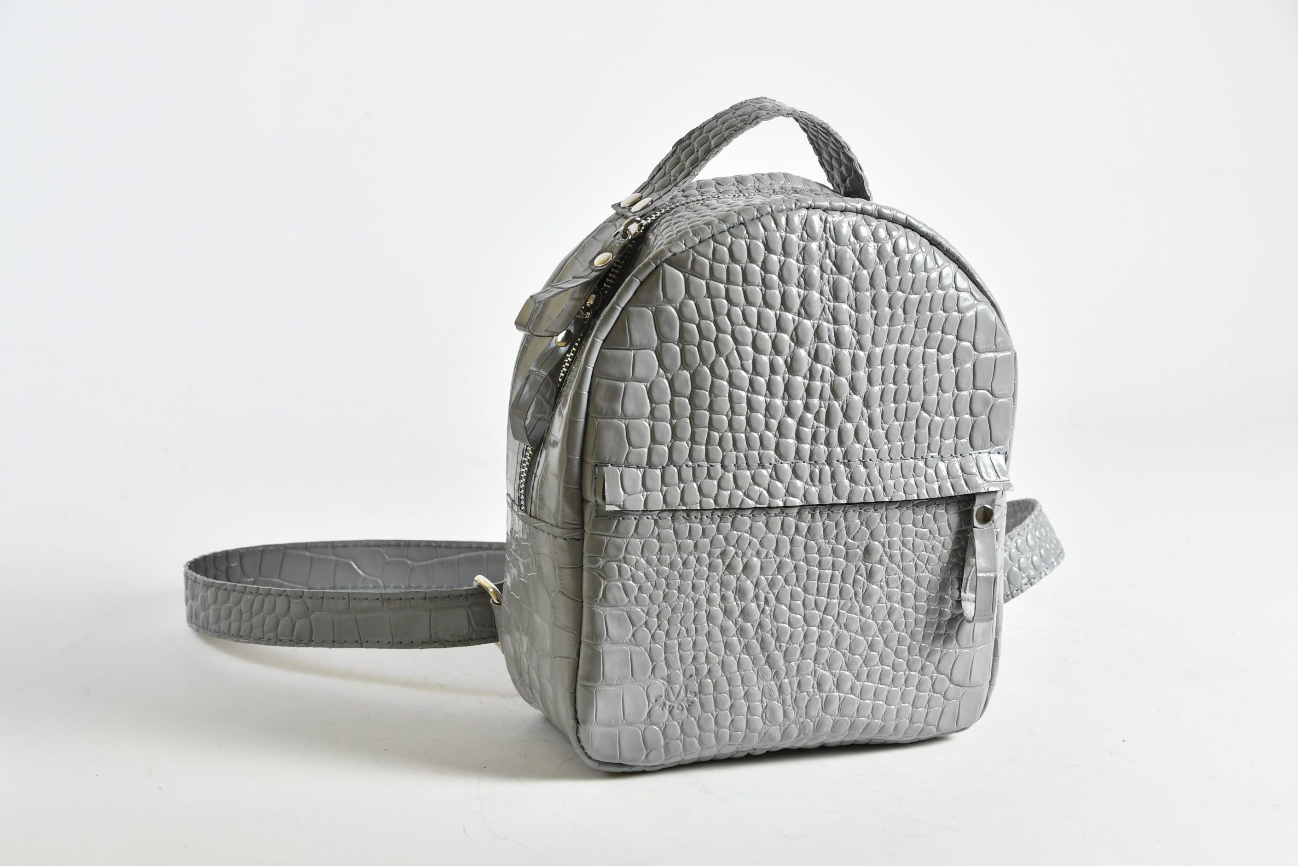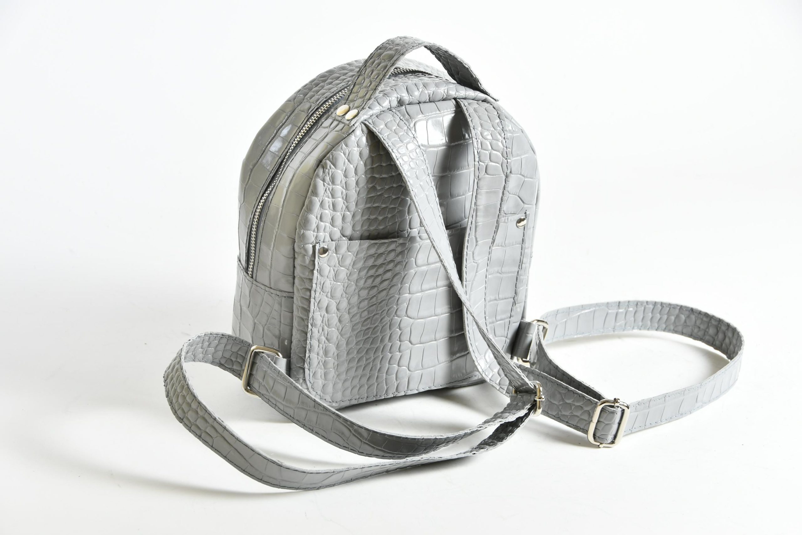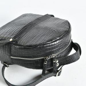 Рюкзак середнього розміру, але дуже місткий. Попереду кишеня на замочку. Позаду звичайна кишенька. Всередині доволі глибока кишеня. Без підкладки. Матеріал: натуральна шкіра італійського виробництва з тисненням “під крокодила”, стійка поверхня з невеликим глянцем, глибокий насичений колір . Розмір: 26 х 22 х 9 см.
