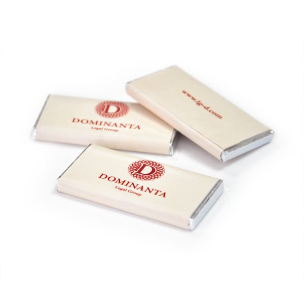 Натуральний німецький шоколад преміум класу. Розмір 64 х 32 х 5 мм. Упаковка із крейдованого паперу 90 г. Повнокольоровий друк упаковки . Фольга срібна або золото. Сам шоколад може бути молочним-33%, чорним – 60 %, білим -28%. Вартість вказана за одиницю .