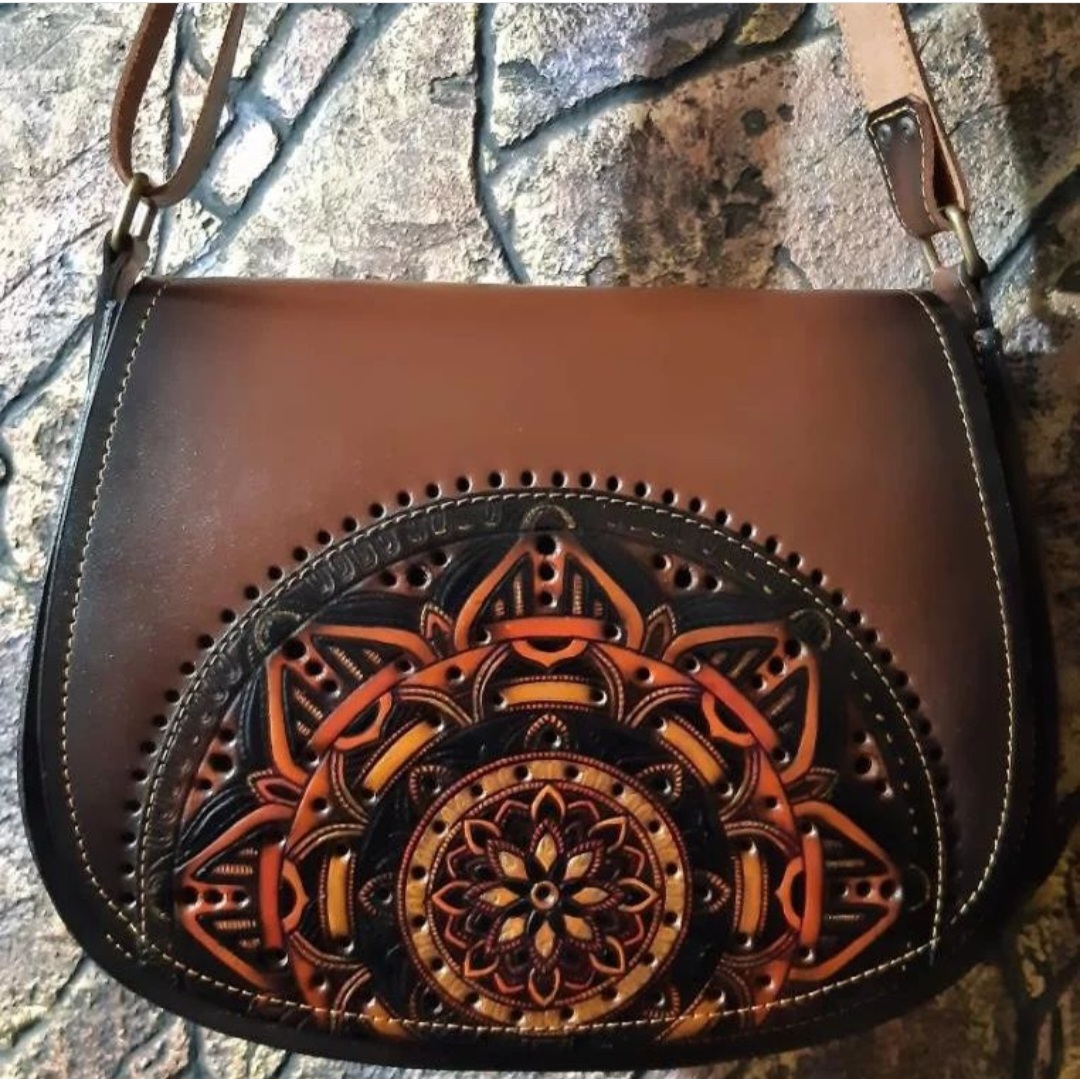Вишукана сумка ” Valeria “, із натуральної шкіри, знімний клапан та регулюючий ремінь . Малюнок зроблений за допомогою тиснення , випалювання та розпису. Розмір сумки 27×21×6см.