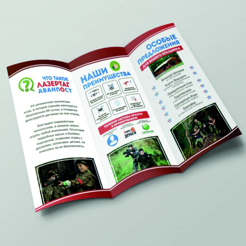 Розмір в розгорнутому виді – 297*210 мм . Розмір в готовому виді – 99*210 мм . Папір крейдований глянцевий – 170 г/м2 , 2 згина . Друк з 2-х сторін.